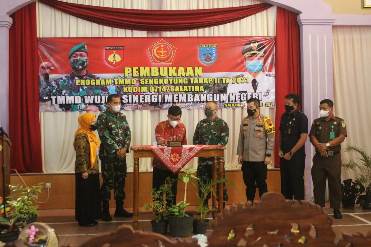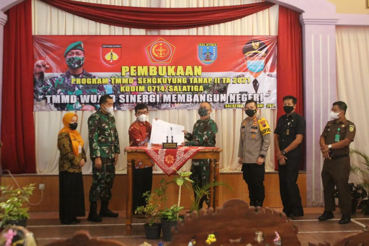 Salatiga-Nasionalnews.co.id-Rangkaian acara Penandatanganan dan Penyerahan Naskah Serah Terima Program TNI Manunggal Membangun Desa (TMMD) Sengkuyung Tahap II Tahun 2021 oleh Wakil Walikota Salatiga Dr. Muh Haris, SS, MSi dan Komandan Kodim 0714/Salatiga Letkol Inf Loka Jaya Sembada.S.I.P, disaksikan oleh Kasrem 073/Makutarama Letkol Czi Hendro Edi Busono ,Kapolres Salatiga AKBP Rahmad Hidayat S.S,Ketua Pengadilan Negeri Salatiga Riyono, S.H., M.H., Ketua Kejaksaan Negeri Salatiga Edy Bujanayasa, S.H.,serta MH,Sekda Kota Salatiga ,Drs. Fahrurrozi.,M. Si yang dilaksanakan di Aula Balai Bhakti Praja Jl. Ki Penjawi Kel. Sidorejo Lor Kecamatan. Sidorejo Kota Salatiga,Selasa (15/06)