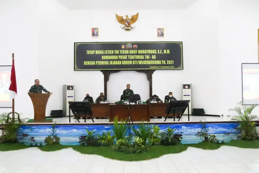 Dalam kunjungan tersebut Danpusterad memberikan pengarahan secara langsung kepada para Perwira jajaran Korem 071/WK di Aula Makorem 071/WK serta para personel Kodim jajaran Korem 071/WK yang juga mengikuti pengarahan tersebut secara virtual. Danpusterad menyampaikan bahwa dari hasil beberapa Lembaga Survei Nasional 4 tahun terakhir, TNI masih menempati urutan tertinggi dalam hal kepercayaan masyarakat. Ini tidak lain merupakan hasil dari kinerja para Aparat Teritorial di lapangan yang dengan totalitas menjalankan semua tugas dengan ikhlas dan maksimal bekerja membantu pemerintah terutama dalam penanganan pandemi Covid-19.