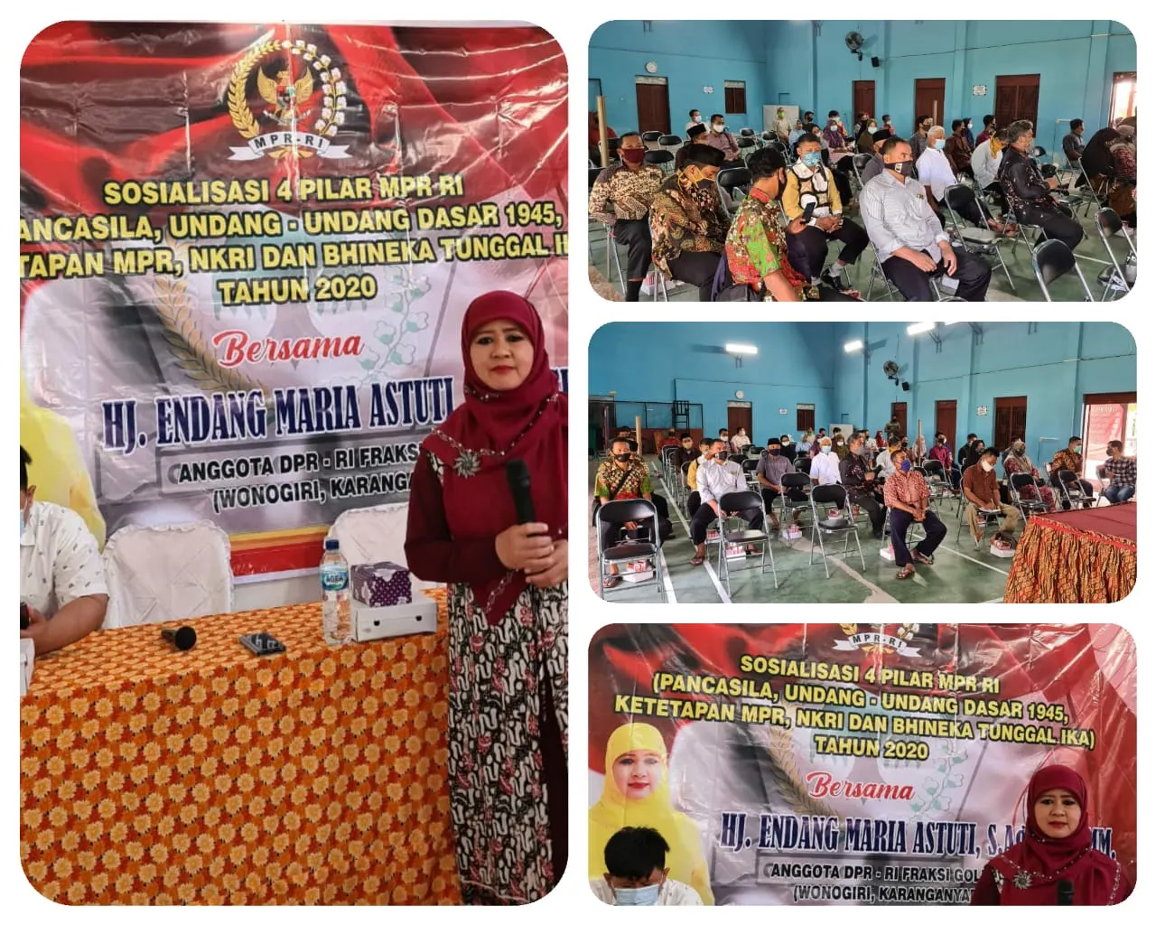 Wonogoro, Nasionalnews.co.id – Hj.Endang Maria Astuti,S.A,g,.S.H,.MH Anggota MPR RI/DPR RI Fraksi Golkar yang duduk di komisi VIII.membidangi Sosial,Keagamaan,Bencana,Perlindungan Anak.mengelar acara Sosialisasi 4Pilar. yang di selengarakan,pada 14/11/2020.di wonogiri,Jawa-tengah.
