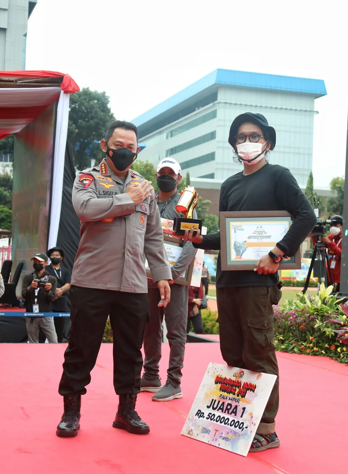 Dalam kegiatan ini, Kapolri menyerahkan piala sekaligus sertifikat penghargaan kepada 10 pemenang Bhayangkara Mural Festival 2021. 10 orang pemenang tersebut dipilih oleh para dewan juri.