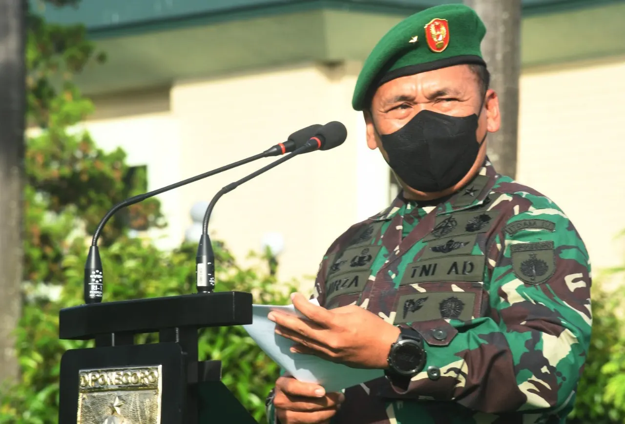 Semarang – Irdam IV/Diponegoro Brigjen TNI Mirza Agus, S.I.P., mewakili Pangdam IV/Diponegoro Mayjen TNI Widi Prasetijono bertindak sebagai Inspektur Upacara (Irup) dalam pelaksanaan upacara bendera 17-an bertempat di Lapangan Makodam IV/Diponegoro, Selasa (17/05/2022).