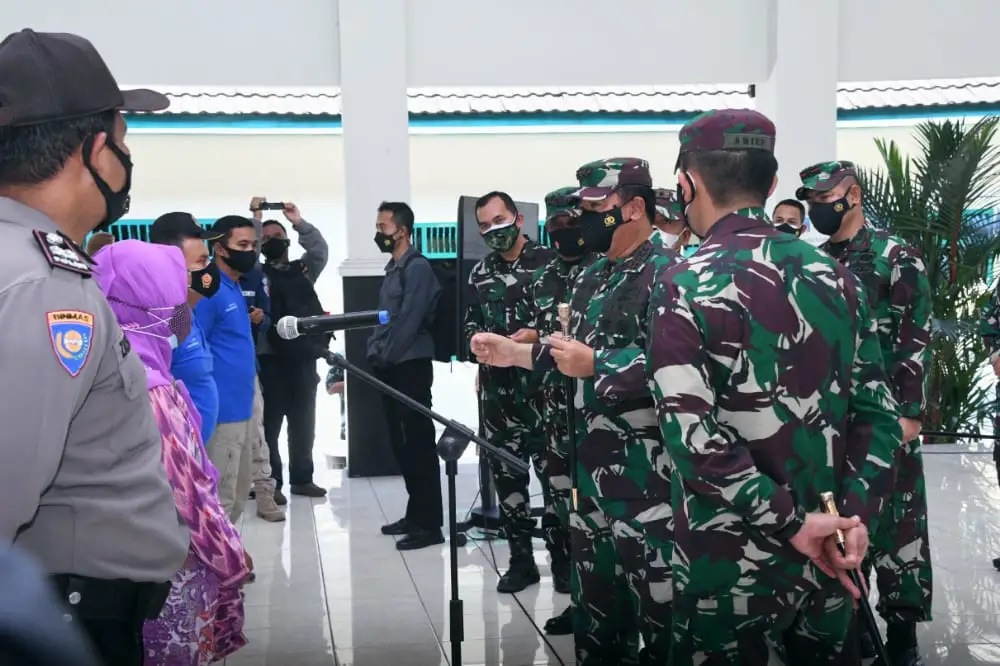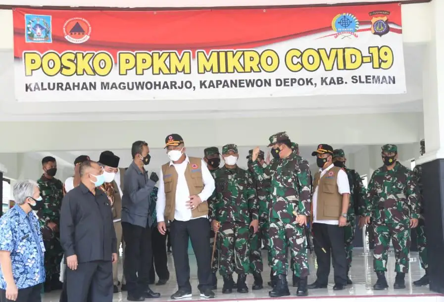 Panglima TNI Marsekal TNI Dr. (H.C.) Hadi Tjahjanto, S.I.P. dan Kepala BNPB Letjen TNI Ganip Warsito, S.E., M.M. beserta rombongan didampingi oleh Pangdam IV/Diponegoro Mayjen TNI Rudianto tinjau pelaksanaan Posko PPKM Mikro dalam penerapan sistem Si Lacak (Tracer Digital) Covid-19 yang bertempat di Kelurahan Maguwoharjo, Kecamatan Depok, Kabupaten Sleman, Rabu (28/07/2021).