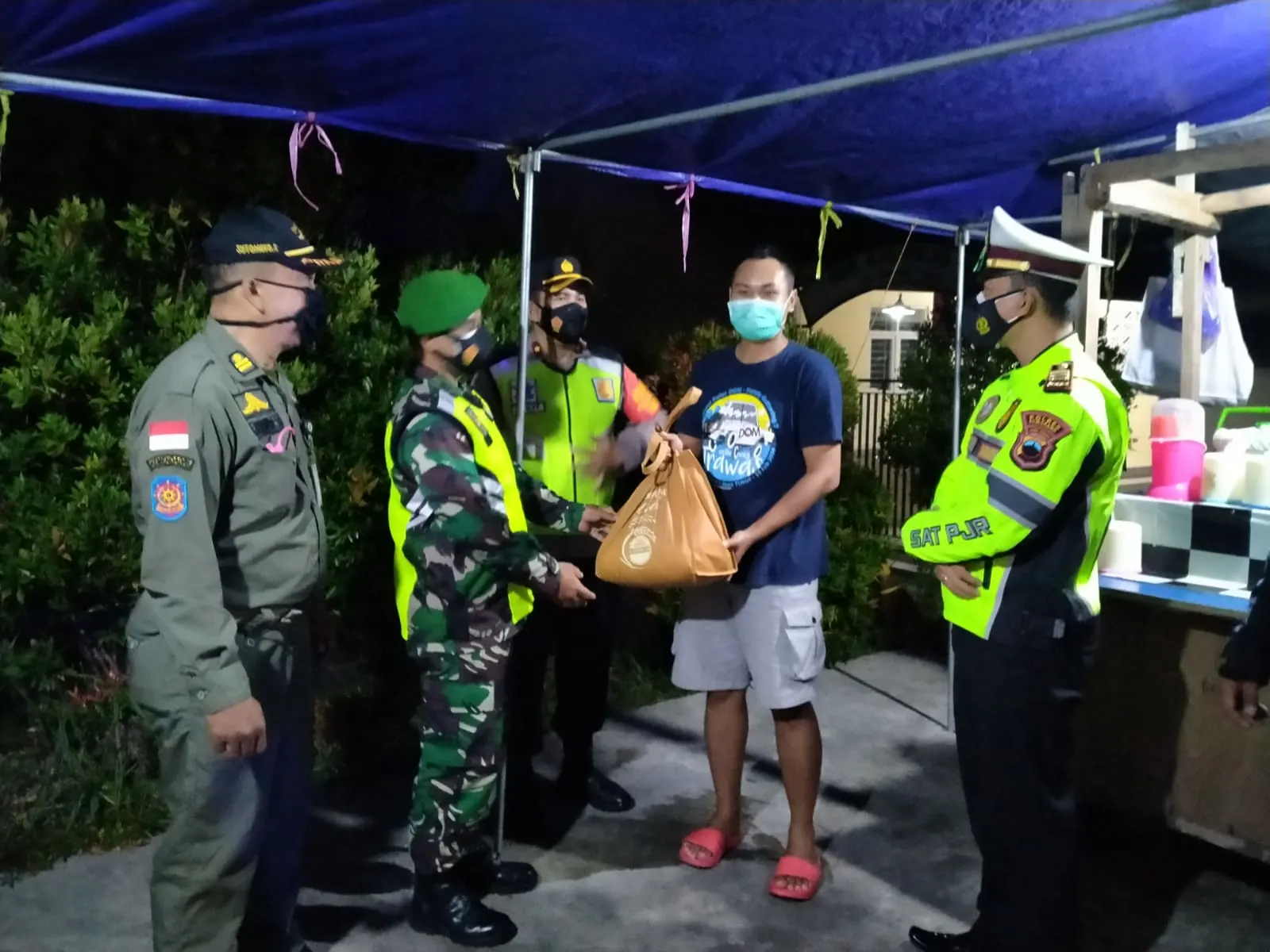 ” Pemberian Bansos kepada pedagang kecil, penjual angkringan, penjual pecel lele dan PKL yang di temui disepanjang route patroli sebanyak 120 paket dibagikan sekaligus disampaikan Himbauan protokol kesehatan.