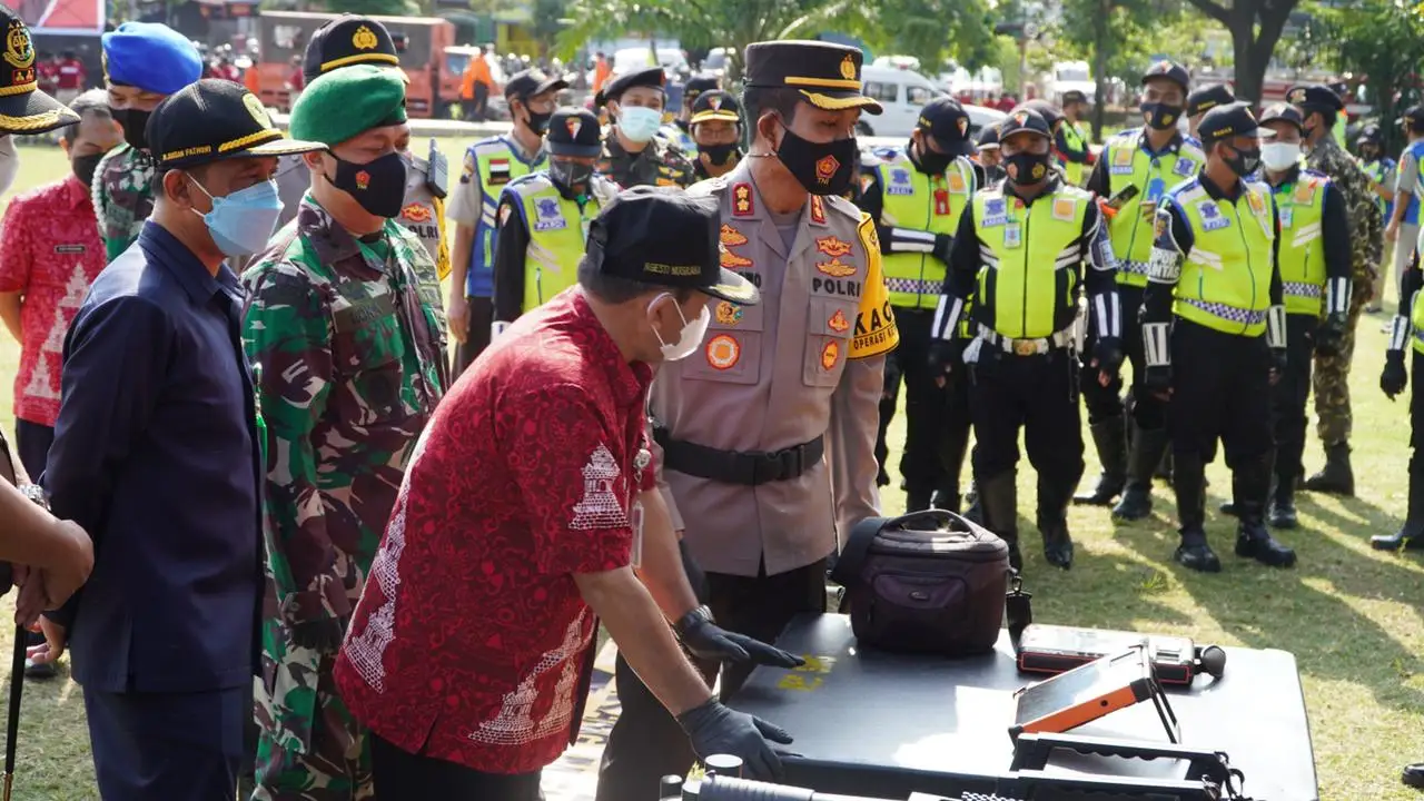 Semarang, Nasionalnews.co.id-Dipimpin 3 pilar Bupati Semarang, Kapolres Semarang dan Dandim 0714/ Salatiga, Kepolisian Resor Semarang, Jawa Tengah, laksanakan apel gelar pasukan Operasi Ketupat Candi 2021 di halaman Alun alun Bung Karno Ungaran Kabupaten Semarang, Rabu (5/5/2021)