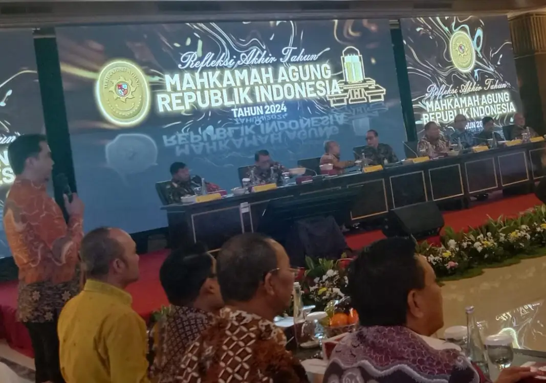Jakarta – Ketua Mahkamah Agung (MA), Prof. Dr. H. Sunarto, SH, MH, bersama para pejabat MA, menyampaikan Refleksi Akhir Tahun 2024 di Balairung Mahkamah Agung, Jakarta, pada Jumat pagi (27/12/2024).