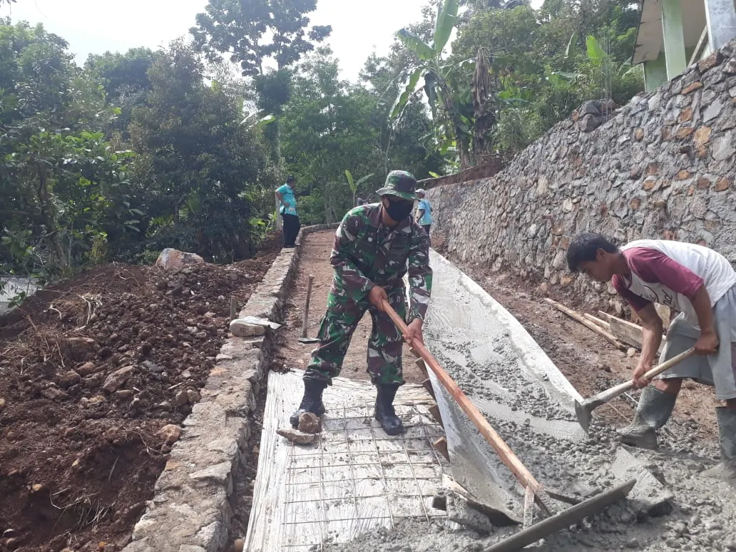Tampak Sertu Dimas , anggota satgas TMMD bersama Sapari (30) sedang meratakan adukan pengecoran jalan sepanjang kurang lebih 168 meter itu. Dengan ketebalan cor kurang lebih 20 Cm , di Desa Sidorejo Lor Kodia Salatiga .